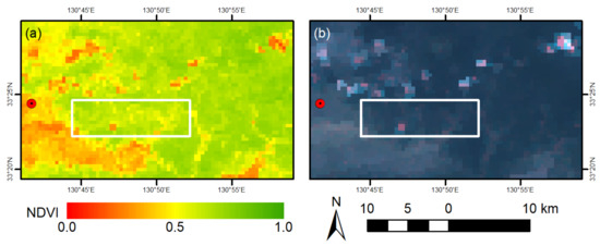 VIIRS images over the study area for 13 July 2017: (a) NDVI and (b) natural-color composite. The VIIRS overpass time was ~12:50 p.m. JST on the date. The white line boxes represent the region used for the correlative analysis (see Section 3.1 and Figure 6). The map was created with ArcGIS® software (ArcMapTM 10.6.1, Esri, Redlands, CA, USA, http://www.esri.com).