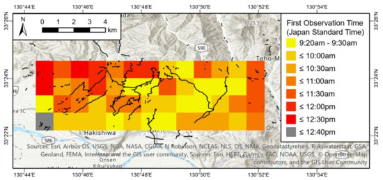 Lastly, we determined the time at which very first clear-sky observations were obtained with AHI for the boxed region in Figure 5 on 13 July 2017, the first sunny day after the rain event (Figure 12). The analysis of AHI NDVI temporal profiles with the sunshine duration data indicated that the NDVI slightly varied over time even over clear-sky conditions (i.e., Figure 7). Thus, we considered those observations whose NDVI values were greater than 0.95 times the maximum NDVI of that date confidently clear and recorded the time of first such observations found in AHI 10 min resolution data for every pixel. As seen in Figure 12, the first clear observations were acquired at various times from 9:20 a.m. JST to 12:30 p.m. JST, or a ~3 hour period. For the lower-left corner pixel, the first clear-sky observation was acquired at 12:40 p.m., but there occurred no landslide at this location (see Figure 5).