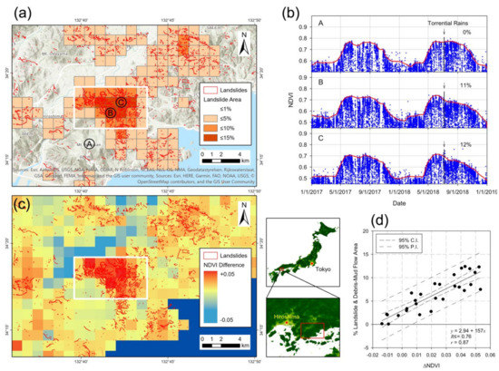 Summary of AHI NDVI landslide detection analysis for a torrential rain event in Hiroshima, Japan in the summer of 2018. The location of the analysis area is indicated on the two frames at the bottom center. (a) Percent landslide areas (including debris-mud flow areas) derived from the landslide- and debris-mud flow polygon dataset (shown as “Landslides” on the map) [47]. The circled letters (A, B, and C) correspond to the locations where AHI NDVI temporal signatures in (b) were extracted. The white line box represents the region used for the correlative analysis in (d). (b) AHI NDVI temporal profiles of landslide- and debris-mud flow-affected pixels. The filled squares are AHI NDVI values whereas the red lines are the smoothed NDVI profiles (see Appendix A). (c) ΔNDVI (pre-event NDVI minus post-event NDVI). Five day local means centered on 18 June 2018 and 5 August 2018 were used as pre-event and post-event NDVI values, respectively. (d) Percent landslide and debris-mud flow area vs. ΔNDVI crossplot. The C.I. and P.I. are, respectively, the confidence and prediction intervals. The maps were created with ArcGIS® software (ArcGIS® Pro 2.4.1, Esri, Redlands, CA, USA, http://www.esri.com).