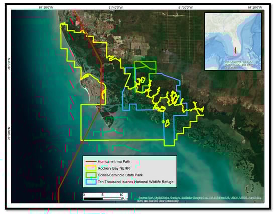 Southwest Florida, USA, showing the path of Hurricane Irma (red line in main graphic and in the inset showing the western Gulf of Mexico and the state of Florida; ArcGIS Basemap Source: ESRI). Local management jurisdiction boundaries are shown in different colors. NERR, National Estuarine Research Reserve.