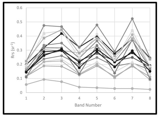 Additionally, some scenes contained specular reflection (“sunglint”) off water surfaces. These preclude the accurate identification and classification of many pixels as “water”. Removing sunglint from satellite images is common practice [,], but has not been implemented in high-resolution images in an automated fashion to our knowledge. To deglint our images, we identified the spectral signature of glinted pixels and applied a regression-based correction using all water pixels in the image. Rrs images were evaluated for spectral signatures of glint and glint-free water pixels. We identified a sun glint spectral signature (Figure 3) across scenes, whereby reflectance values in bands from one array were consistently lower or higher than adjacent bands from the other array. This pattern was robust for bands 3–8, but not for the coastal or blue bands (i.e., bands 1 and 2).