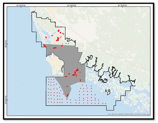 Ground-reference points collected within the Rookery Bay NERR (jurisdiction boundary shown in black) to validate the classified maps (ArcGIS Basemap Source: ESRI). Area of overlap between annual maps that was used for change detection is displayed in grey.