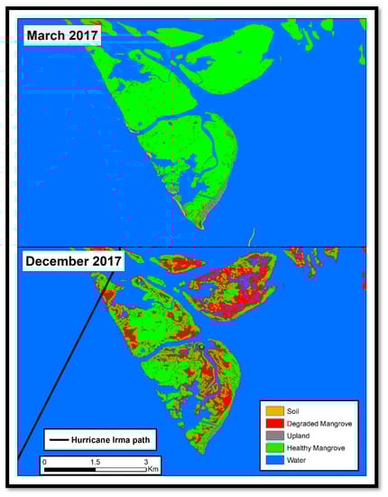 Because of the lack of consistent coverage between the different seasonal periods, we focused our pre- and post-Hurricane Irma change detection analysis on a 65 km2 area near the center of the reserve (Figure 4). We observed a net loss of 6.85 km2 (22%) of mangrove forest from spring 2016 to fall 2018. Of this, 4.97 km2 was lost in the six-month period after Hurricane Irma. In the following 6 months, a total of 1.73 km2 of mangroves recovered, but 1.6 km2 was converted to bare soil. We interpret the latter as mangrove die-off, because it indicates that mangrove stands remained defoliated for at least one full growth season following the initial hurricane-induced defoliation that occurred after the September 2017 hurricane. These patterns are consistent with those observed by [], which described both short-term and delayed mortality of mangroves as a result of wind-induced defoliation, and marl-overwash-deposit root smothering, respectively, based on field surveys of mangrove forests within and adjacent to Rookery Bay NERR. Indications that mangrove forests recovered during the growing season were confirmed by findings of [], that a 40%–70% reduction in mangrove-canopy cover by wind-induced defoliation facilitated the recruitment of mangrove saplings. Upland vegetation results follow a similar pattern that we interpret as hurricane-induced loss followed by some recovery and some die-off. Seasonal phenology is unlikely to be a substantial driver in these results as the region experiences a subtropical climate with negligible winter senescence of wetland or upland vegetation.
