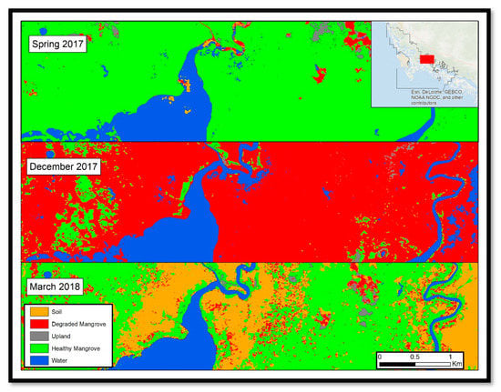 The synoptic, seasonal maps of recovery and die-off patterns (Figure 6) will be used by reserve managers to prioritize mangrove conservation and restoration efforts. Efforts to map global tropical wetlands have relied on medium-resolution or coarser satellite imagery, and required years of processing to complete []. Further, detection of change in 10–30 m pixels covering 100–900 m2 each may be insufficient for identifying gain or loss before irreversible changes have already occurred. Addressing these challenges will require accurate, global, automated mapping of high-resolution images.