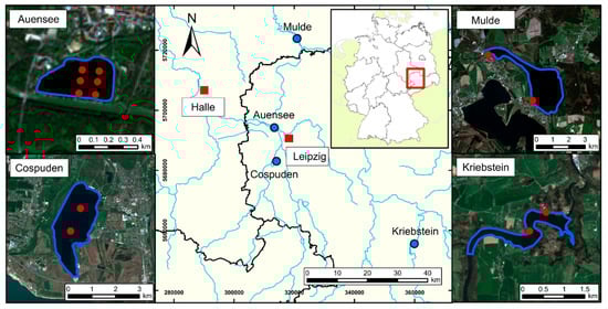 Location of the lake sites in Central Germany and sampling points (red dots) for water column measurements (satellite imagery: Sentinel 2A - RGB – 432 (17/04/2019); coordinate system of the map: ETRS89/UTM zone 33N).
