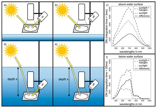 Field measurement setup for underwater reflectance retrieval: the upper row shows radiance measurements on the reference panel for calibration with light source turned on (a) and turned off (b). The difference of (a) and (b) represents the signal contributed by the light source only, which was used for instrument calibration (c). The lower row shows measurements below the water surface with the light source turned on (d) and turned off (e). The difference between measured spectra in configuration of (d) and (e) represents the reflected signal that only refers to the illumination from the artificial light source (f).