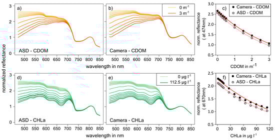 Comparison of experimental laboratory measurements between ASD FieldSpec 4 and UHD 285 hyperspectral camera at various levels of colored dissolved organic matter (CDOM) (a,b), and chlorophyll a (CHLa) (d,e) concentrations. Panels (c,f) show a direct comparison of the measured reflectance at specific key wavelengths sensitive to changes in CDOM and CHLa, respectively.