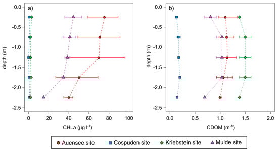 Vertical distribution of CHLa (a) and CDOM (b) for the investigated lake sites. Points mark the layer-specific mean, solid lines mark the layer-specific range of measured reference values.