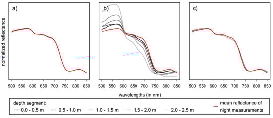 Comparison of reflectance spectra acquired at Cospuden site during (a) nighttime measurements, (b) daytime measurements without compensation for sunlight attenuation, and (c) daytime measurements with compensation for sunlight attenuation.