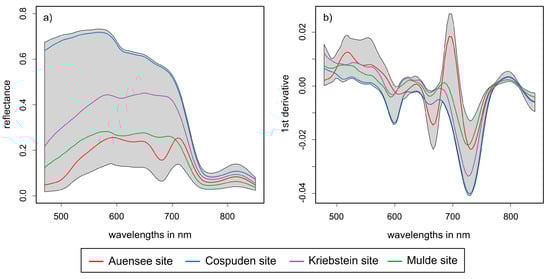 Mean visible and near-infrared (VNIR) reflectance spectra (a) and first derivative of mean VNIR reflectance spectra (b) of the investigated lake sites in the range 470–850 nm. The colored spectral curves represent the mean spectra of each lake. The shaded region displays the range between the minimum and maximum values at each wavelength for the entire data set.
