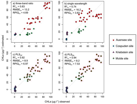 Measured and cross-validated prediction values of CHLa with error metrics based on the entire dataset: (a) three-band ratio, (b) single wavelength at 690 nm of first derivative, (c) partial least squares (PLS)ref = PLS regression based on reflectance spectra, and (d) PLSfds = PLS regression based on first derivative spectra. The dashed line represents the 1:1 line.