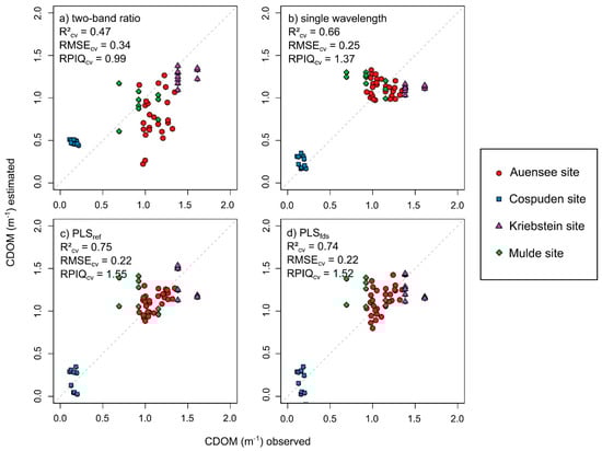 Measured and cross-validated prediction values of CDOM with error metrics based on the entire dataset: (a) two-band ratio, (b) single wavelength at 602 nm of first derivative, (c) PLSref = PLS regression based on reflectance spectra, and (d) PLSfds = PLS regression based on first derivative spectra. The dashed line represents the 1:1 line.