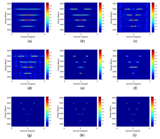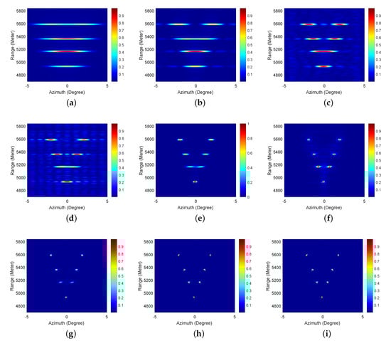 For the simulation, the original scene consisted of three groups of adjacent targets at distances of 5600, 5360, and 5160 m, as well as one island target at a distance of 4930 m, as shown in Figure 2. The antenna pattern was a function, defined as , with beam width of 3.5°. Therefore, according to the Rayleigh criterion, the minimum distinguishable distances at the range bin of adjacent targets were , , and m, respectively. The radar worked in X-band, the scanning region was , and the scanning speed was .