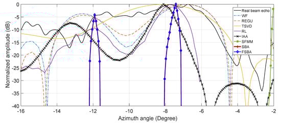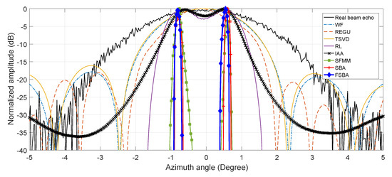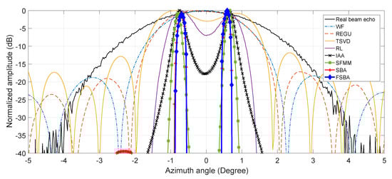 where denotes the signal amplitude and denotes the side-lobe amplitude. From the table, we can see that SFMM, SBA, and the proposed FSBA had better performance in beam sharpening and side lobe suppression than the other methods. Additionally, the entropy of their processing results was smaller than that of the other methods.