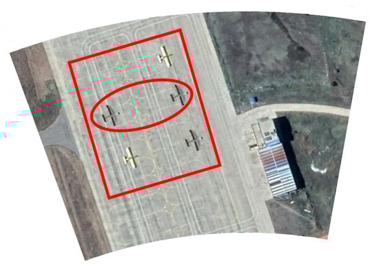 The optical scene, which is shown in Figure 7, was captured from Google earth. It can be seen that the original scene is an airport runway with five co-operative airplanes (marked by the red rectangle). Furthermore, the red circle covers two adjacent airplanes. After antenna scanning, pulse compression, and range walk correction, the real beam echo with low resolution is shown in Figure 8a. In Figure 8a, we cannot distinguish the exact number of planes on the runway. For the real data, the noise is also assumed as GWN and the SNR is defined in Equation (30). Figure 8b–d show that the WF, REGU, and TSVD methods achieved poor resolution improvement and noise suppression. RL and IAA can further improve the resolution, but have limited performance in noise suppression, as shown by Figure 8e,f; in particular, false targets appear in the IAA result, which makes it impossible to determine the number and location of real targets. Figure 8g–i are the processing results of SFMM, SBA, and FSBA, respectively. It can be seen that they have higher resolution and that not only adjacent planes are distinguished, but also the noise is greatly suppressed. Therefore, we can clearly see that the target area has five strong points; that is, the locations of the real targets. Comparing Figure 8h,i, it can be seen that FSBA and SBA had almost the same performance; that is to say, after acceleration, the performance of the SBA had almost no degradation.