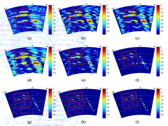 Results of airport data: (a) Real beam echo; (b) WF; (c) REGU; (d) TSVD; (e) RL; (f) IAA; (g) SFMM; (h) SBA; and (i) FSBA.