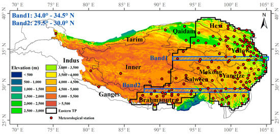 Basic information of the Tibetan Plateau (TP). The area enclosed by the dark line denotes the eastern TP (ETP) (with a high density of meteorological stations), the red circles denote meteorological stations, and the two bands are used to evaluate elevation dependency of precipitation products’ estimation biases.