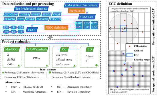 The performance of the 10 precipitation products was evaluated from three aspects: magnitude agreement, occurrence consistency and elevation dependency. The evaluation procedure is presented in Figure 2. The magnitude agreement represents the errors of precipitation magnitude and temporal consistency of a product, and it is calculated against the CMA data for monthly precipitation at the grid-cell scale and watershed scale. To conduct a reasonable evaluation of the products against the point-scale CMA observations, the CMA station observations were first interpolated into six different spatial resolutions according to the resolutions of the ten precipitation products. The interpolation method uses a linear regression model and considers both the elevation and inverse squared distance between the stations [,,]. Then, an effective grid cell (EGC) was defined according to the spatial resolution of a product (Figure 2 (right)). For spatial resolutions of 0.04° or 0.05°, an EGC is the grid cell containing no less one station; otherwise, it is defined as a gird cell with at least five stations around (0.75° from the center). Therefore, as indicated in Figure 2, the number of EGCs varies from 16 (for CMAP with resolution of 2.5°) to 134 (for products with the resolution finer than 0.25°) due to the different spatial resolutions of the products. The interpolated CMA datasets with different spatial resolutions are collectively referred to hereinafter as CMA data. We assume that the precipitation estimates within the EGC of each precipitation product is comparable with the CMA data at the corresponding resolution.