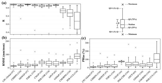 Magnitude agreement (R, RMSE (mm/mon), and PBias (%)) of the 10 precipitation products against China meteorological administration (CMA) data. Three measures (a) R, (b) RMSE and (c) PBias. The values for the EGCs associated with each product are represented by circles, and the number of EGCs is shown in the X-axis label after each product.