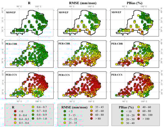 Spatial distribution of R, RMSE (mm/mon), and PBias (%) for the typical examples of the multi-source weighted-ensemble precipitation (MSWEP), precipitation estimation from remotely sensed information using artificial neural networks-climate data record (PER-CDR), and precipitation estimation from remotely sensed information using artificial neural networks-cloud classification system (PER-CCS) products against CMA data.