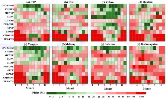Mean annual cycles of monthly precipitation bias (%) of each precipitation products over seven watersheds (Hexi, Yellow, Qaidam, Yangtze, Mekong, Salween, and Brahmaputra) and the entire ETP region.