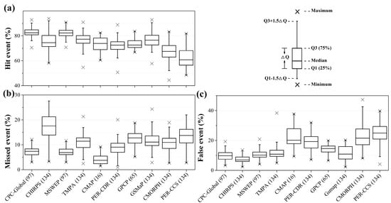 According to the spreads (Q75–Q25), the 10 products showed similar variabilities with respect to hit event, but different degrees of variability with respect to missed and false event. In missed event, CHIRPS product presented the largest variability, and MSWEP had the lowest variability. In false event, CMORPH exhibited the largest variability, and CHIRPS had the lowest variability. Three products (i.e., MSWEP, TMPA, and GSMaP) can therefore be assumed to perform well in capturing precipitation occurrence, while two products (CMORPH and PER-CCS) presented higher degrees of variability, lower percentages of hit events, and higher percentages of missed and false events.