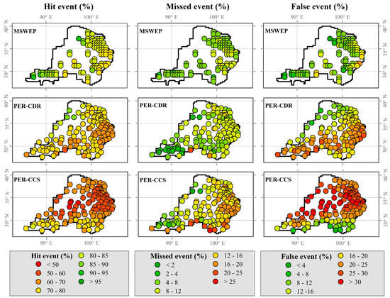 The spatial distribution of the three measures for the 10 products are illustrated in Figures S4–S6, and MSWEP, PER-CDR, and PER-CCS were selected as examples, as in Section 3.1 (Figure 7). The performance of the precipitation products varied in different regions. For instance, MSWEP exhibited better consistency with the CMA data in the southern ETP, with a hit event percentage of 85.0%, which dropped to 82.1% in the northeastern ETP. PER-CCS performed similarly, with the percentage of hit events dropping from 72.9% to 60.1%. The change is mainly due to the increase in the percentage of false events (from 14.7% to 27.5%). PER-CDR showed an even distribution over ETP for hit events, but the percentage of missed events dropped from 10.2% (northeastern ETP) to 6.0% (southern ETP), while the percentage of false events increased from 15.0% to 22.5%.