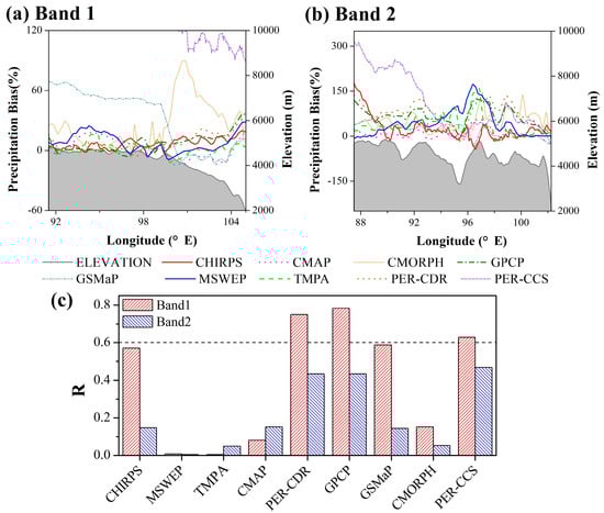 Variation in satellite-based precipitation bias and corresponding elevation changes over the two typical elevation bands (a,b); and the R values between the satellite-based precipitation bias and the elevation (c). The PER-CCS product is not fully displayed in (a) due to its anomaly.