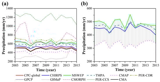 Annual precipitation according to the 10 precipitation products and the interpolated CMA for the ETP (a); Annual precipitation according to CHIRPS, MSWEP, TMPA, and CMAP products for the entire TP (b).