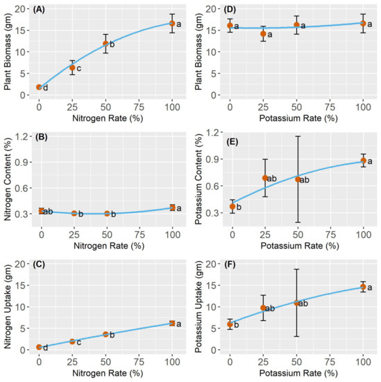 For the nutrient content measurements, the K experiment generated a higher variability, ranging from an average of 0.4 to 0.8 grams of K per pot, and treatments were significantly different from each other. The N content varied from 0.32 to 0.37 grams of N per pot (Figure 2). In the N experiment, the N uptake of all the treatments was significantly different (α = 0.05) from each other, while for the K experiment, only treatments 0%, 25%, and 100% were different. It appeared that at the V6 crop growth stage, different N rates had a greater effect on N uptake than the K rates affected the K uptake. It was observed that the N uptake variability resulted from biomass weight, showing plant growth deficiency, whereas K uptake variability resulted from the plant K content. Benders et al. [6] reported that by the V6 crop growth stage, N uptake accumulation represents around 20% of the total N requirement for the entire life-cycle of the maize plant and only 10% of the total K requirement.