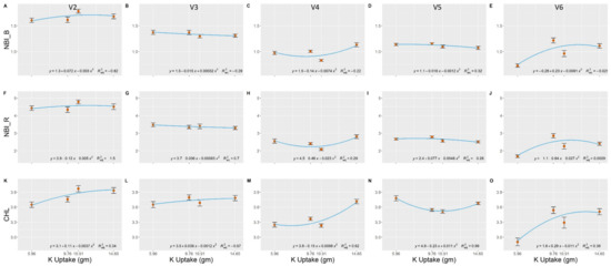 The three fluorescence indices (Equation (1)–(3)) in this study successfully estimated N uptake at the V2 crop growth stage. All three indices (NBI_B, NBI_R, and CHL) consistently enabled detection of N variability in the maize canopy throughout the crop growth stages. Regression analysis was used to model the relationship between N uptake and the three indices for the four different crop growth stages (Figure 3).