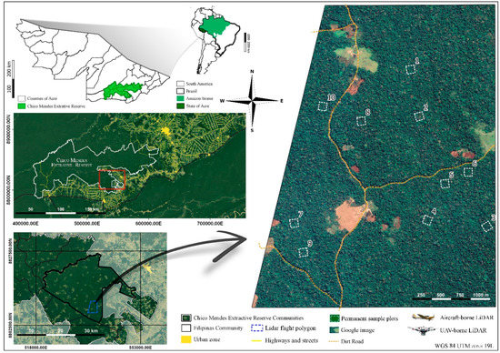 The objective of this study was to compare LiDAR data and its products obtained from two different platforms: aircraft and UAV. Specifically, we compared: (a) LiDAR point clouds and metrics; (b) digital terrain, surface and canopy models, and (c) aboveground biomass (AGB) models for a group of forest inventory plots located in an Amazonian tropical forest in the Chico Mendes Extractive Reserve in Acre, Brazil.