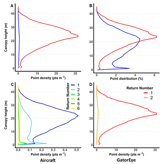 (A,B) GatorEye (red) and Aircraft (blue) LiDAR point density (pts m−2) and distribution (% per 1 m vertical zone) vertical profiles. (C) Vertical profile of point density for all returns for aircraft (1–6) and (D) for GatorEye (2).