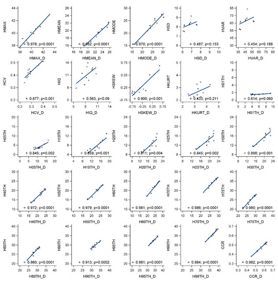 Plot-scale LiDAR metrics for aircraft and GatorEye systems are presented in Table 5 and Table 6, respectively. Figure 4 shows their statistical comparison and highlights that most metrics were significantly correlated. Metric in the lower height quartiles (H05TH to H20TH) had lower correlations than those in the higher quartiles. Overall, metrics having a poor correlation (p < 0.05; e.g., HSD, HVAR, and HCV) were influenced by point cloud density. Complete tables of Aircraft- and GatorEye-derived LiDAR structural metrics are provided in the Supplementary Materials.