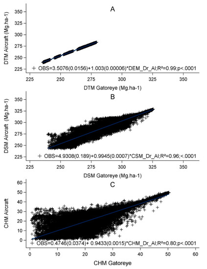 Comparison of the digital terrain model ((A)—DTM), digital surface model ((B)—DSM), and digital height model ((C)—DHM/canopy height model (CHM)) produced by aircraft and GatorEye systems. Numbers in parentheses are the standard errors for each coefficient.