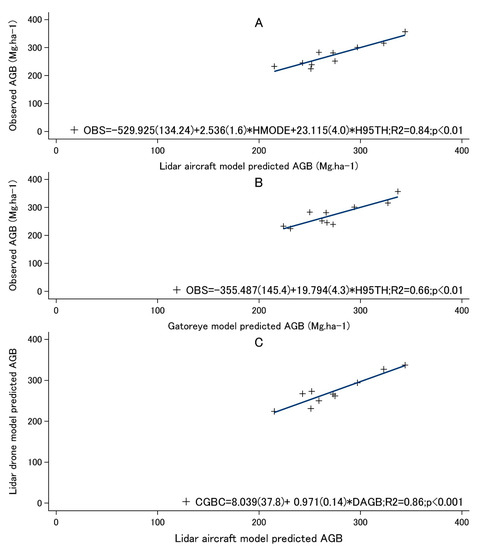 Predicted versus observed ground plot values for aboveground biomass (Mg·ha−1) for models produced by the (A) aircraft system and (B) GatorEye system, and (C) their comparison. Numbers in parentheses are the standard errors for each coefficient.