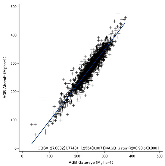 One current use of the AGB models produced by LiDAR is through the use of satellite images to upscale AGB estimates to a regional scale. Usually, when large LiDAR samples are available, a first upscale is performed from the field plot scale to LiDAR sampled area [44,45]. Here, we tested the possibility to upscale the AGB model produced by GatorEye. AGB LiDAR models can be, when functioning correctly, generalized [46] or applied in different regions [42]. In our extrapolation of both models to the entire area covered by the 2015 LiDAR flight, the AGB maps produced presented a surprisingly high correlation, as both models used the same LiDAR metrics as independent variables, and these metrics were unaffected by the difference in cloud point density (see Figure 3). When the same procedure was performed with the GatorEye univariate regression model, although the model correlation was still high, there was a tendency for the model to slightly underestimate AGB values.