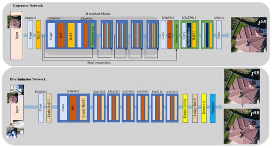 where and stand for the input LR image and the predicted super-resolved image, respectively. In contrast to the adversarial loss for the generator in the original SRGAN model, in Equation (7), in which only gradients from the generated images take part in adversarial training, the adversarial loss for the generator in ESRGAN, in Equation (22), contains both and . This property causes the gradients from both real images and generated images to participate in adversarial training [32].