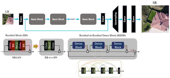 Network Architecture: ESRGAN employs the basic architecture of SRResNet [23] for feature learning in the LR feature space. ESRGAN introduces two modifications to the generator architecture of SRGAN to improve the quality of the super-resolved images, G: (1) it removes all batch normalization (BN) layers; (2) it replaces the original basic residual block (RB) in SRGAN with a more compact RRDB architecture. According to Figure 4, by optimally combining multi-level residual blocks, the RRDB design improves the perceptual quality of super-resolved images [32]. When the statistics of image batches for training and testing are significantly high, BN layers tend to introduce unpleasant artefacts limiting the generalization ability [32]. Removing BN layers, especially under the GAN framework which is more prone to artefact generation, leads to consistent higher performance, lower computational complexity, and better generalization in the network [32,59]. In addition to the architectural improvement, to facilitate training a very deep network, ESRGAN exploits residual scaling technique [55,59] to prevent instability in training by scaling down the residuals using a scaling factor between 0 and 1 before adding them to the main path. Moreover, ESRGAN employs a smarter initialization technique, which has empirically been shown to provide easier training when the initial parameter variance becomes smaller [32].