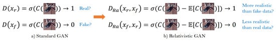 - Jolicoeur-Martineau, A. The relativistic discriminator: A key element missing from standard GAN. arXiv 2018, arXiv:1807.00734. [Google Scholar]