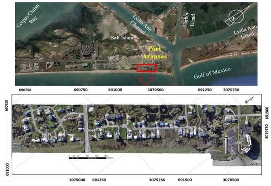 Port Aransas is a town located on Mustang Island along the southern Texas Gulf of Mexico coastline, USA Figure 7. In 2017, Hurricane Harvey, a category 4 hurricane, made landfall to the north of Port Aransas along San Jose Island on the night of 25 August 2017. The southern portion of the eye wall passed within close proximity to Port Aransas causing extensive damage, primarily due to extreme winds but also surge coming from the bay side of the island.