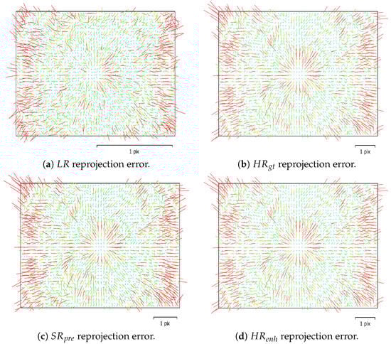 SfM photogrammetry procedure, as illustrated in Figure 6, is employed on all available image sets including HR ground truth, LR, and predicted SR image sets. SfM photogrammetry is a low-cost method, based on stereoscopic photogrammetry, for highly accurate topographic reconstruction using a series of overlapping images acquired from multiple viewpoints [78]. In contrast to traditional photogrammetry, in SfM photogrammetry, interior geometry of the camera, usually referred to as interior orientation () parameters, position and orientation of each camera station with respect to the scene’s global coordinate system, commonly called exterior orientation () parameters, and the geometry of the scene, i.e., the 3D coordinate of each point of the 3D scene, are resolved automatically. All required parameters are calculated simultaneously based on the highly redundant and iterative bundle adjustment (BA) computations using a rich database of corresponding image features automatically extracted from a set of multiple overlapping images [79]. SfM photogrammetry addresses the key problem of determining the 3D locations of a large number of corresponding features extracted from multiple overlapping images, taken from different positions and angles with respect to the 3D scene.