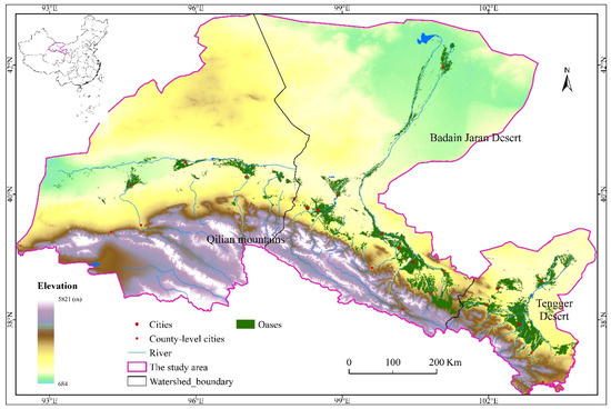 The main land cover types are bare land (76.65%), grassland (16.28%), cultivated land (4.96%), and forest (0.65%) according to the Global Land Cover dataset of 2010 [46]. Desert is the dominant landscape and vegetation covered areas are mainly concentrated in the southern Qilian mountains and oasis areas (Figure 1). Oases in the Hexi region have a total area of approximately 1.52 × 104 km2 (2017) and a population of 4.5 million. Three inland rivers: Shiyang, Heihe, and Shule pass through the Hexi region and are the main available water resources for vegetation growth. All in all, the Hexi region clearly represent a typical dryland with complicated geographical environments and intensive human activities.