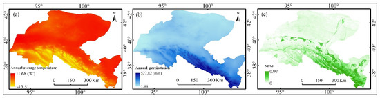 The spatial patterns of annual average temperature (a) and annual precipitation (b) in the Hexi region. The multi-year monthly precipitation and temperature gridded datasets over the period 1961–2000 obtained from the National Science and Technology Infrastructure [45] were summed and averaged, respectively, to generate the precipitation and temperature dataset shown in (a) and (b), respectively. (c) represents the maximum gNDVI (normalized difference vegetation index average over the growing season) for the period 2001−2017.