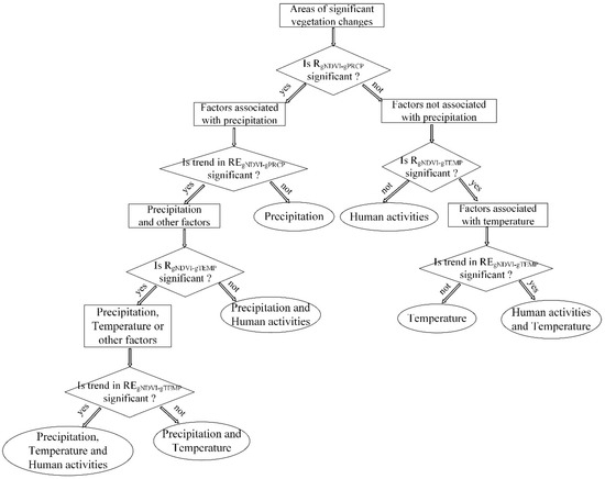 RESTREND analysis was also executed in areas where vegetation changes are closely related to precipitation to examine if a significant trend existed in residuals derived from the linear regression between gNDVI and gPRCP (REgNDVI–gPRCP). If there was no significant trend in the residuals, vegetation changes were considered to be caused only by precipitation; otherwise, changes in vegetation were caused by factors associated with precipitation. In areas where vegetation changes were affected by factors associated with precipitation, the Pearson correlation analysis between gNDVI and gTEMP was carried out to infer if vegetation changes were also affected by temperature; where there was no significant gNDVI–gTEMP correlation, it meant that vegetation changes only benefited from precipitation and human activities; and for areas with a good gNDVI–gTEMP correlation, a significant REgNDVI–gPRCP indicated that vegetation changes were affected by precipitation, temperature, and human activities; otherwise, vegetation changes in these areas are affected only by precipitation and temperature.