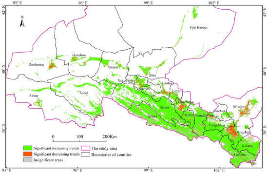 Trends of vegetation changes in the Hexi region of northwest China detected by the method proposed in our previous study [49]. Only vegetation covered areas with the maximum gNDVI over the period 2001−2017 with not less than 0.2 were discussed in our study.