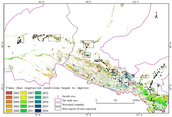 The time that vegetation conditions began to improve in the Hexi region. Areas in the black dotted frames represent the main regions of oasis expansion obtained from previous local study [57].