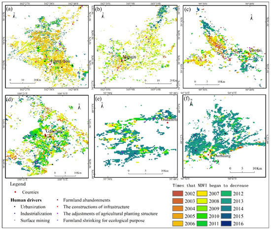 The time that NDVI began to decrease in the oases where decreasing trends were concentrated (as showed in Figure 4). (a)–(f) represent the time that NDVI began to decrease in Liangzhou (a), Minqin (b), Gaotai (c), Ganzhou (d), Guazhou (e), and Dunhuang (f), respectively. The human drivers of the decreasing trends in the sample sites obtained from various investigations according to the trends and time of vegetation changes were further classified and are shown in the figure.