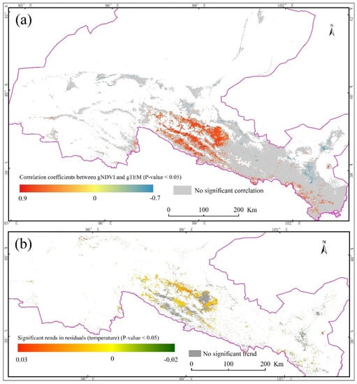 Correlation coefficients between gNDVI and gTEMP in the Hexi region over the period 2001−2017 (a) and trends in residuals derived from the linear regressions between gNDVI and gTEMP (b).