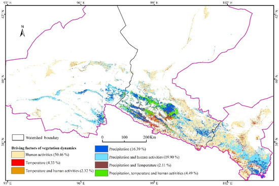 The results of driving factor analysis based on the new classification framework demonstrated that factors associated with human activities accounted for 72.34% of the significant vegetation changes. Human activities had profoundly affected vegetation changes in the Hexi region, especially in the oasis areas and the downstream areas of the river basins where vegetation changes could not be fully interpreted by climate variations. The findings in the study agreed with the standpoints in previous local studies [27,66].
